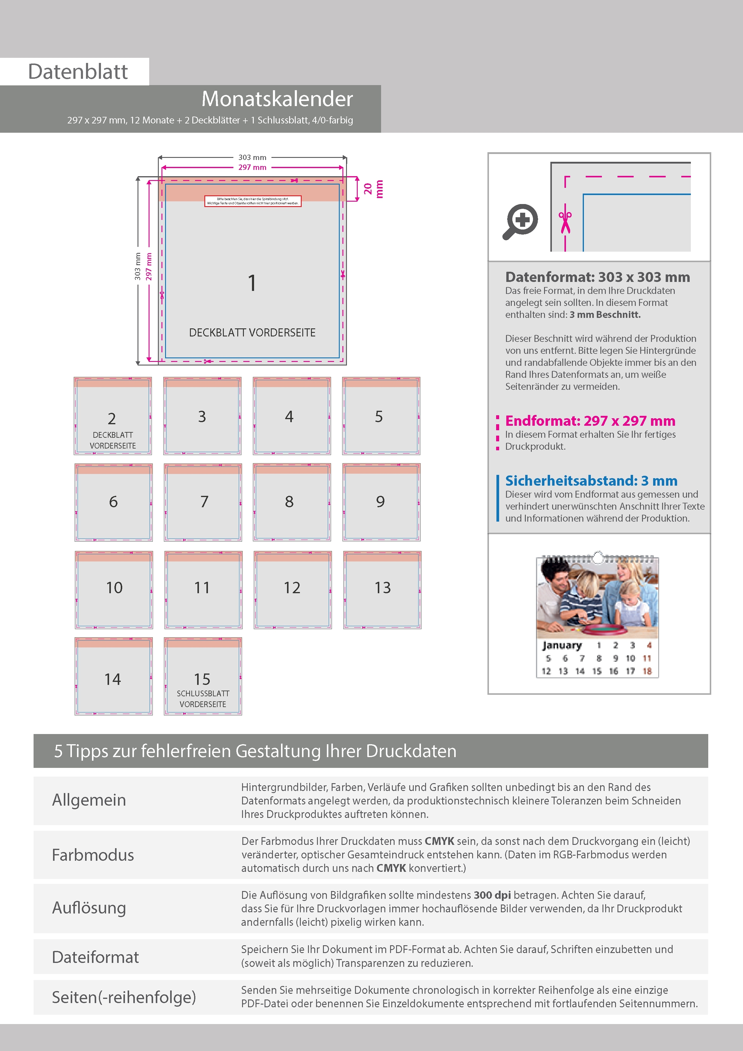 Monatskalender 15 Blatt (12 Monate + 2 Deckblätter + 1 Schlussblatt)
